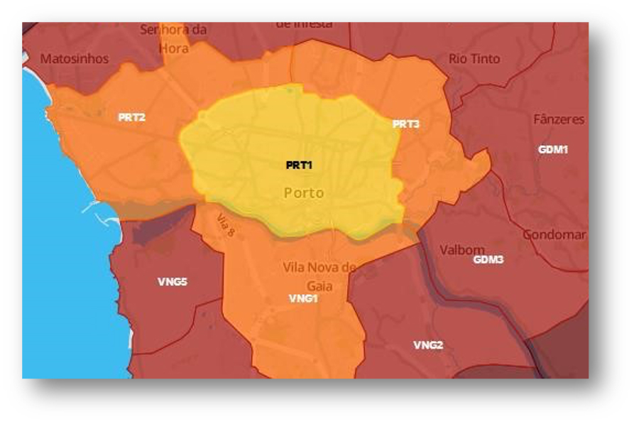 To move around in Porto using public transportation, you will first need to understand how the system works. The city and the outskirts are divided between zones in which some titles of the public transport grid are valid and others are not. The city center is located within PRT1 (yellow area), while the PRT2 and the PRT3 also are within the city limits. Universidade Católica Portuguesa is located in Zone PRT2.